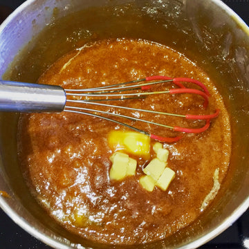 Our salted caramel is made by hand the old-fashioned way. We caramelise the sugar, then add organic cream and butter, vanilla, a bit of glucose and Maldon sea salt.
